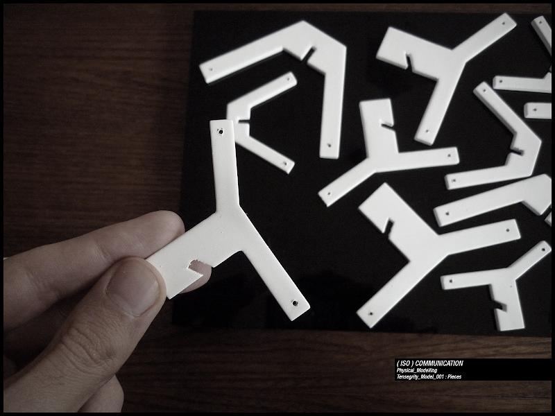 After the physical test a more complex component, still tetrahedrical, was develop and its spreading was conceived not only in a linear way but also in space to create an enclosing surface. Different values for relative positions, angles, distances and also scale created different effects.
