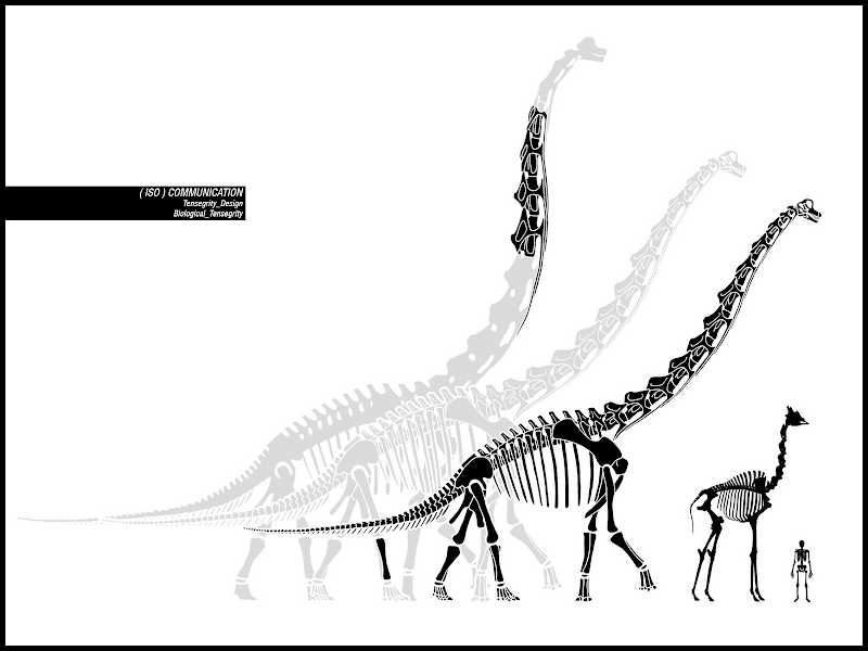 We can find plenty of biological tensegrity‘s examples in biological world: in the mast of a plant (Frei Otto did some very interesting experiments about it, you can see some of its models remade by students here, work and pictures by Jonh Efel, I thank him to let me use them) with compressed segments and tense tracheids; in the neck of an Apatosaurus (Brontosaurus) , with a length of about ten meters, made of compressed vertebrae and tense muscles; in the neck of a mammal like a horse or the in human vertebral column, as I will explain.